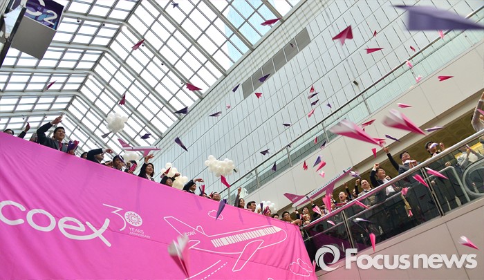 (서울=포커스뉴스) 4일 오전 서울 강남구 코엑스에서 열린 30주년 이색 시무식에 참석한 코엑스 임직원들이 종이비행기를 날리며 한 해의 힘찬 시작을 알리고 있다.
