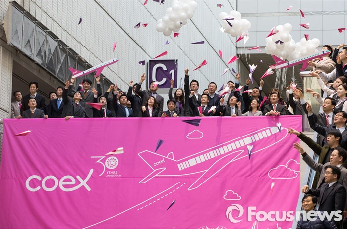 (서울=포커스뉴스) 4일 오전 서울 강남구 코엑스에서 열린 30주년 이색 시무식에 참석한 코엑스 임직원들이 종이비행기를 날리며 한 해의 힘찬 시작을 알리고 있다.