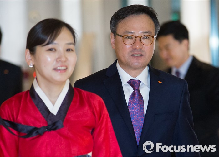 (서울=포커스뉴스) 장동현(오른쪽) SK텔레콤 사장이 4일 오전 서울 광진구 워커힐호텔에서 열린 SK그룹 신년회에 참석하고 있다.