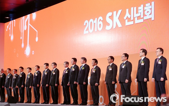 (서울=포커스뉴스) 최근 혼외로 아이를 둔 사실을 고백해 파문을 일으키고 있는 최태원(가운데) SK그룹 회장이 4일 오전 서울 광장동 워커힐호텔에서 열린 그룹 신년회에 참석해 임원들과 함께 무대에 올라 인사를 하고 있다.