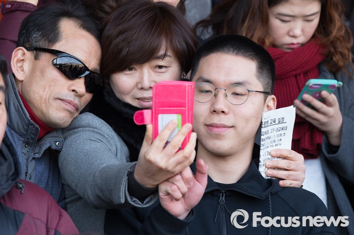 (논산=포커스뉴스) 4일 오후 충남 논산 육군훈련소 입영심사대에서 입영장병이 부모와 사진을 찍고 있다.
