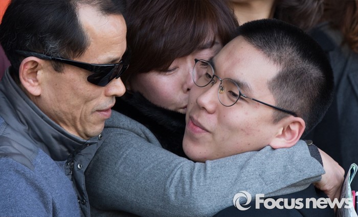 (논산=포커스뉴스) 4일 오후 충남 논산 육군훈련소 입영심사대에서 입영장병들이 부모와 포옹을 있다.