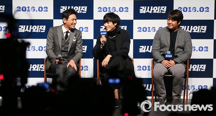 (서울=포커스뉴스) 4일 오후 서울 강남구 압구정 CGV에서 열린 영화 '검사외전' 제작보고회에 참석한 강동원(가운데)이 인사말을 하고 있다. 왼쪽부터 배우 황정민, 강동원, 영화감독 이일형.