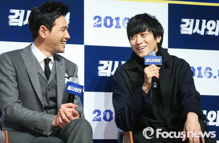 (서울=포커스뉴스) 4일 오후 서울 강남구 압구정 CGV에서 열린 영화 '검사외전' 제작보고회에 참석한 배우 황정민(왼쪽)과 강동원이 환한 미소를 짓고 있다.