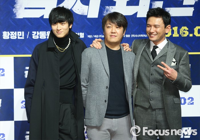 (서울=포커스뉴스) 4일 오후 서울 강남구 압구정 CGV에서 열린 영화 '검사외전' 제작보고회에 참석한 배우 강동원(왼쪽부터), 감독 이일형, 황정민이 포토타임을 갖고 있다.
