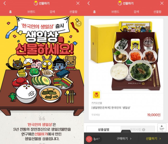 4일 관련업계에 따르면 카카오는 이달 초 5년 전통의 장인정신으로 생일선물만을 연구해온 선물하기에서 만든 생일선물용 상품이라며 선물/쇼핑 카테고리에서 1만9000원짜리 '한국인의 생일상'을 판매했다.