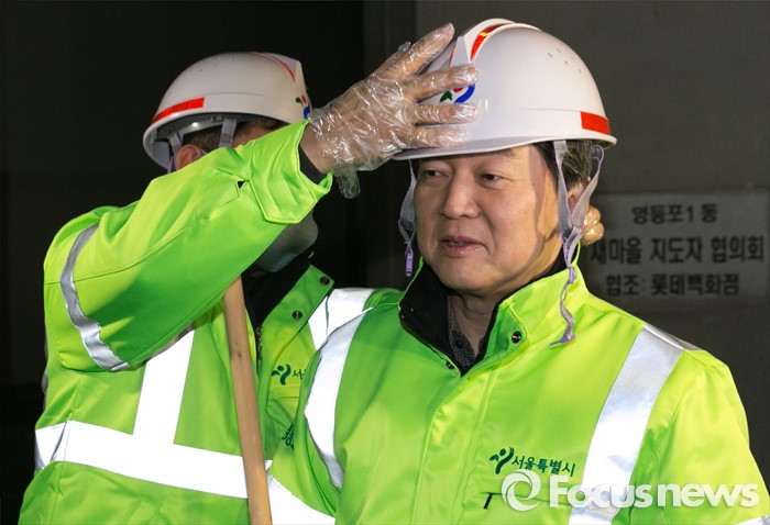 (서울=포커스뉴스) 신당 창당을 추진 중인 안철수 무소속 의원이 5일 오전 서울 영등포역 동부광장 인근에서 새해맞이 청소에 앞서 안전모를 착용하고 있다.