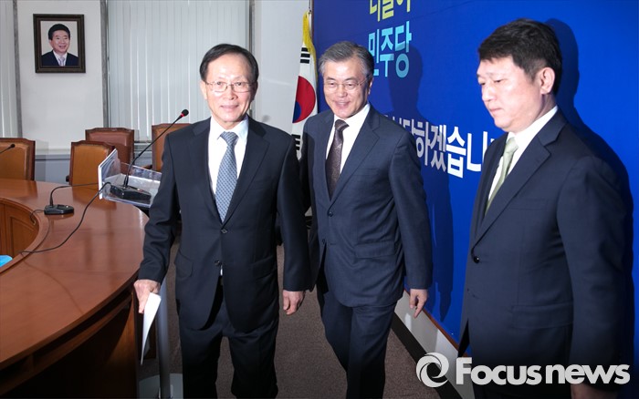 (서울=포커스뉴스) 문재인(가운데) 더불어민주당 대표가 5일 오전 서울 여의도 국회에서 이수혁(왼쪽) 전 6자회담 수석대표와 입당식을 마친 뒤 퇴장하고 있다. 오른쪽은 최재성 총무본부장.
