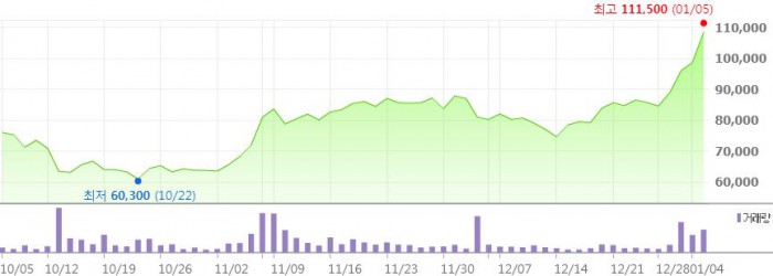 최근 3개월 새 최고치인 11만1500원까치 상승