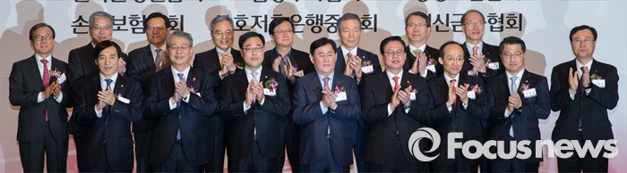 (서울=포커스뉴스) 5일 오후 서울 중구 롯데호텔에서 열린 '2016년 범금융 신년인사회'에서 이주열(앞줄 왼쪽부터) 한국은행 총재, 임종룡 금융위원장, 김기식 정무위원회 간사, 최경환 경제부총리 겸 기획재정부 장관, 정우택 국회 정무위원장을 비롯한 참석자들이 기념촬영을 하고 있다.