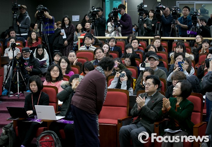 (서울=포커스뉴스) 5일 오후 서울 여의도 국회 의원회관에서 민주사회를 위한 변호사모임, 한국정신대문제대책협의회 등 주최로 열린 긴급진단, 2015년 한일 외교 장관 회담의 문제점 토론회에 참석한 위안부 피해자 이용수 할머니가 참석자들을 향해 인사하고 있다.