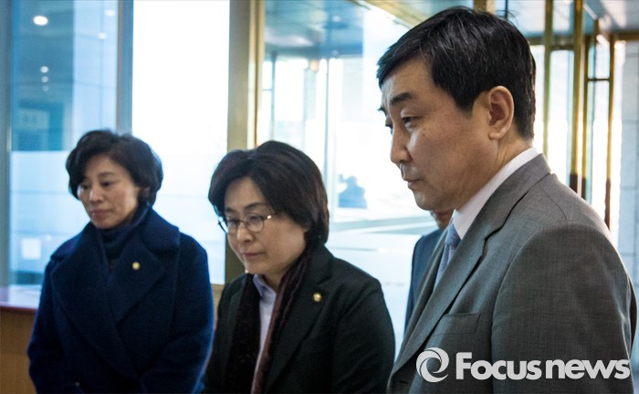 (서울=포커스뉴스) 이종걸(오른쪽부터) 더불어민주당 원내대표, 유승희 최고위원, 남인순 의원이 한일간 위안부 협상과 관련해 5일 오후 서울 종로구 외교부 청사를 항의 방문하고 있다.