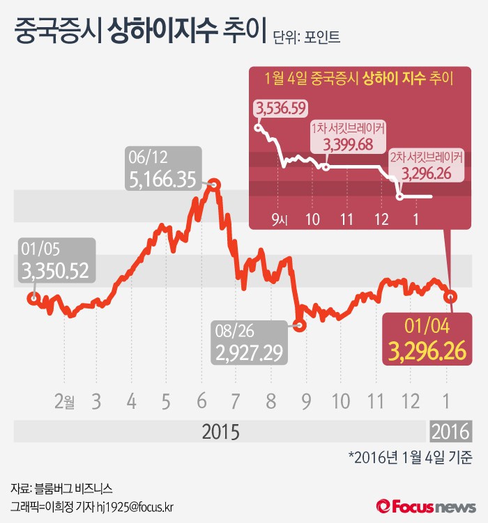 전날 중국증시는 대형주 중심의 상하이선전300 지수가 장중 5.05% 급락, 서킷 브레이커가 발동돼 15분간 거래가 중단됐다. 이후 지수는 또 5% 넘게 떨어지면서 총 낙폭이 7%에 근접하며 거래가 완전히 중단된 바 있다.(서울=포커스뉴스) 중국 증시는 새해 첫날 두 차례 서킷브레이커가 발동되면서 거래가 완전 중단됐다. 2016.01.04 이희정 기자