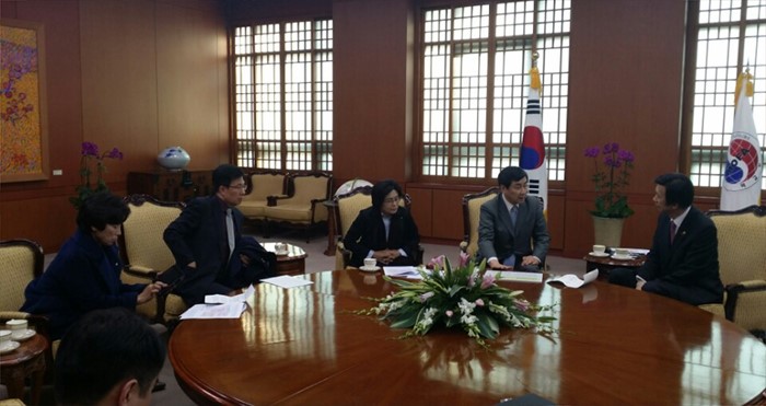 (서울=포커스뉴스) 이종걸 더불어민주당 원내대표가 5일 오후 서울 종로구 정부서울청사 외교부를 한일 위안부 합의와 관련 항의 방문해 윤병세 장관과 대화하고 있다. 왼쪽부터 남인순, 신경민, 유승희 의원, 이 원내대표. 윤 장관. <사진제공=더불어민주당>