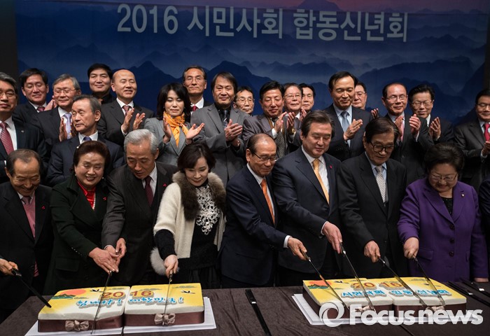 (서울=포커스뉴스) 김무성 새누리당 대표가 5일 오후 서울 중구 프레스센터에서 열린 ‘2016 시민사회 합동 신년회’에 참석, 참석자들과 함께 새해를 축하하며 떡을 자르고 있다.