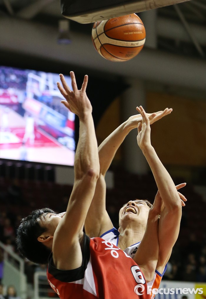 (안양=포커스뉴스) 5일 안양실내체육관에서 열린 2015-2016 프로농구 KGC-전자랜드 경기에서 KGC 정병현과 전자랜드 정휘량이 리바운드 다툼을 하고 있다.