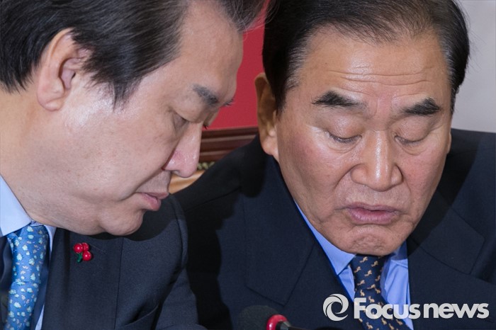 (서울=포커스뉴스) 김무성(왼쪽) 새누리당 대표와 이재오 의원이 6일 오전 서울 여의도 국회에서 열린 최고중진연석회의에 참석해 대화하고 있다.