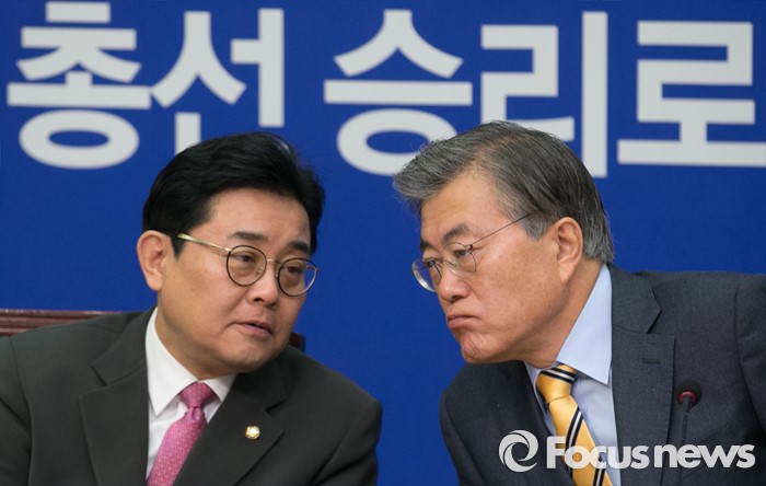 (서울=포커스뉴스) 문재인(오른쪽) 더불어민주당 대표와 전병헌 최고위원이 6일 오전 서울 여의도 국회에서 열린 최고위원회의에 참석해 대화하고 있다.