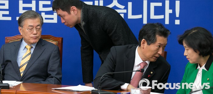 (서울=포커스뉴스) 문재인(왼쪽 첫번째) 더불어민주당 대표와 당직자, 정청래(오른쪽 두번째), 추미애(오른쪽 첫번째) 최고위원이 6일 오전 서울 여의도 국회에서 열린 최고위원회의에 참석해 대화하고 있다.