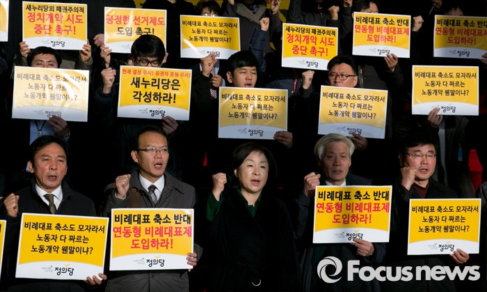 (서울=포커스뉴스) 6일 오전 서울 여의도 국회 로텐더홀 계단에서 심상정 정의당 상임대표 등 지도부 및 의원단이 공정한 선거제도 도입 촉구 및 새누리당 규탄 기자회견을 하고 있다.