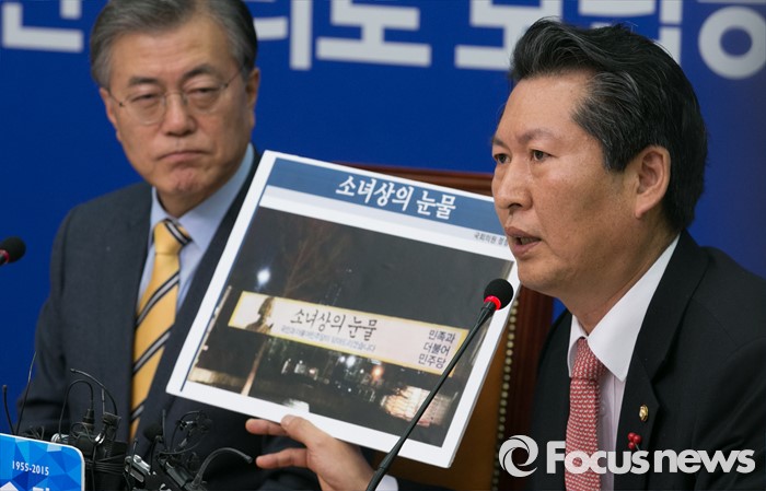 (서울=포커스뉴스) 정청래 더불어민주당 최고위원이 6일 오전 서울 여의도 국회에서 열린 최고위원회의에 참석해 한일 위안부 협상 무효 관련 당 현수막 사진을 들고 발언하고 있다.