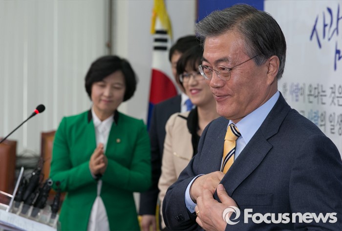 (서울=포커스뉴스) 문재인 더불어민주당 대표가 6일 오전 서울 여의도 국회에서 열린 김선현 세계미술치료학회장 입당식에 참석해 인사말을 마친 뒤 퇴장하고 있다.