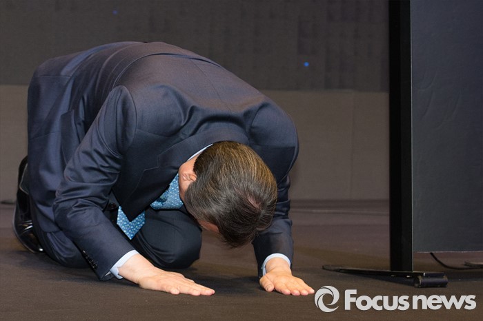 (서울=포커스뉴스) 김무성 새누리당 대표가 6일 오전 서울 영등포구 글래드호텔에서 열린 대한민국헌정회 신년인사모임에서 참석자들에게 새해 인사로 절을 하고 있다.