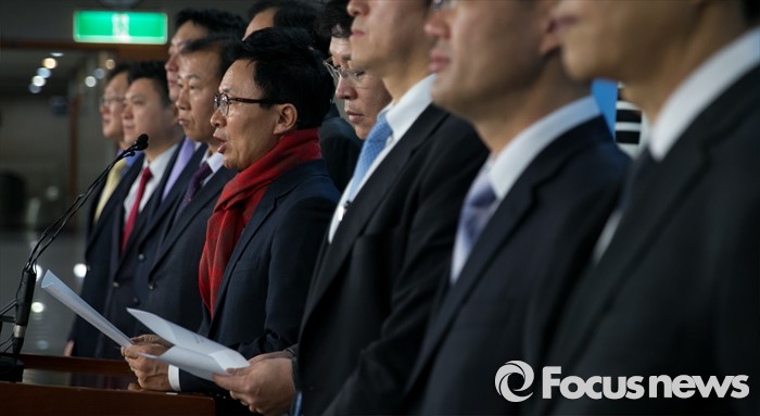 (서울=포커스뉴스) 6일 오전 서울 여의도 국회 정론관에서 정진욱 새정치경제아카데미 원장 등 당원들이 더불어민주당 탈당 및 안철수 신당 합류 기자회견을 하고 있다.