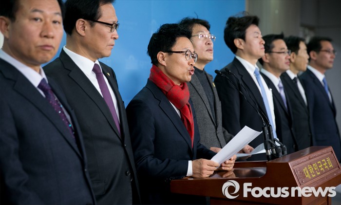 (서울=포커스뉴스) 6일 오전 서울 여의도 국회 정론관에서 정진욱 새정치경제아카데미 원장 등 당원들이 더불어민주당 탈당 및 안철수 신당 합류 기자회견을 하고 있다.