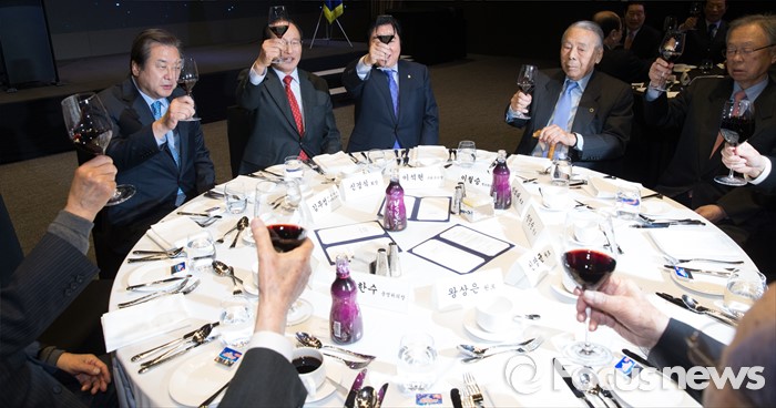 (서울=포커스뉴스) 김무성(왼쪽) 새누리당 대표가 6일 여의도 글래드호텔에서 열린 헌정회 신년인사모임에서 신경식(왼쪽 두번째) 회장 등과 함께 건배하고 있다.