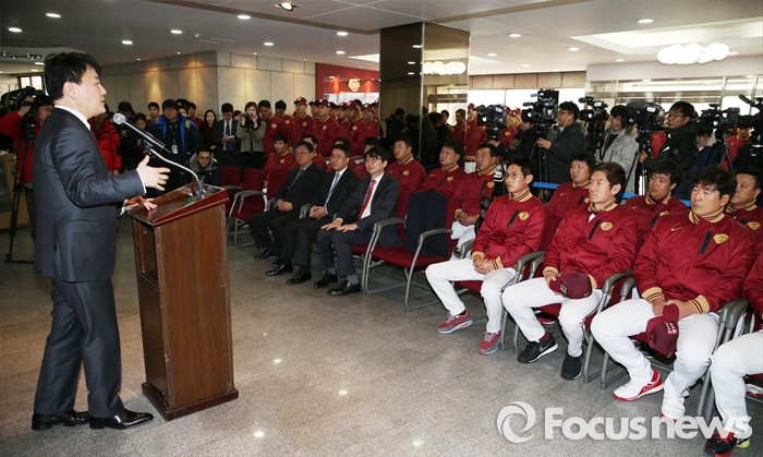 (서울=포커스뉴스) 6일 목동구장에서 열린 프로야구 2016 넥센 히어로즈 시무식에서 이장석 대표가 인삿말을하고 있다.