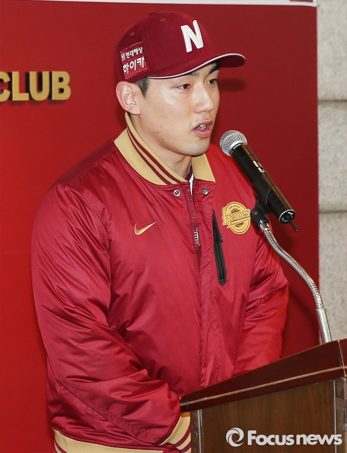(서울=포커스뉴스) 6일 목동구장에서 열린 프로야구 2016 넥센 히어로즈 시무식에서 새로운 주장인 서건창이 신년인사를 하고 있다.