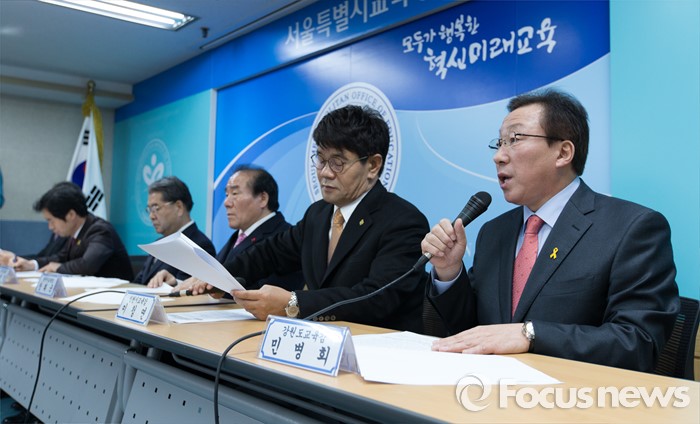 (서울=포커스뉴스) 6일 오후 서울 종로구 서울특별시교육청에서 민병희 강원도 교육감이 정부의 누리과정 예산 미편성 시 강력 대처 발표와 관련해 긴급 기자회견을 하고 있다. 왼쪽부터 조희연 서울시 교육감, 김승환 전라북도 교육감, 이재정 경기도 교육감, 장휘국 광주시 교육감, 이청연 인천시 교육감, 민병희 강원도 교육감.