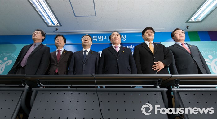 (서울=포커스뉴스) 6일 오후 서울 종로구 서울특별시교육청에서 전국 시도교육감이 정부의 누리과정 예산 미편성 시 강력 대처 발표 관련 긴급 기자회견에 앞서 인사를 하고 있다. 왼쪽부터 조희연 서울시 교육감, 김승환 전라북도 교육감, 이재정 경기도 교육감, 장휘국 광주시 교육감, 이청연 인천시 교육감, 민병희 강원도 교육감.