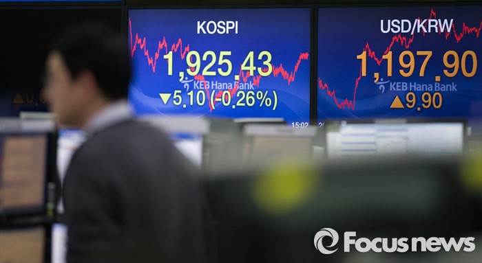 (서울=포커스뉴스) 코스피 지수가 전거래일 보다 5.10포인트(0.26%) 하락한 1,925.43에 거래를 마치며, 북한의 수소탄 실험에도 1920선을 지킨 6일 오후 서울 중구 KEB하나은행 본점 딜링룸에서 딜러들이 업무를 보고 있다. 이날 원달러 환율은 전거래일 보다 9.9원 오른 1197.9원에 마감하며, 지난해 9월 1200.9원 이후 4개월 만에 최고치를 기록 했다.