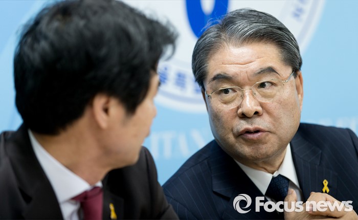 (서울=포커스뉴스) 6일 오후 서울 종로구 서울특별시교육청에서 이재성(오른쪽) 경기도 교육감과 김승환 전라북도 교육감이 정부의 누리과정 예산 미편성 시 강력 대처 발표 관련 긴급 기자회견에서 이야기를 나누고 있다.