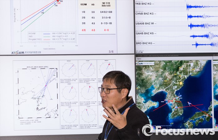 (대전=포커스뉴스) 북한이 수소탄 핵실험을 성공했다고 발표한 가운데 6일 오후 대전 유성구 한국지질자원연구원 지진연구센터에서 신진수 국토지질연구본부장이 북한 수소탄 실험에 대한 조사결과 브리핑을 하고 있다.