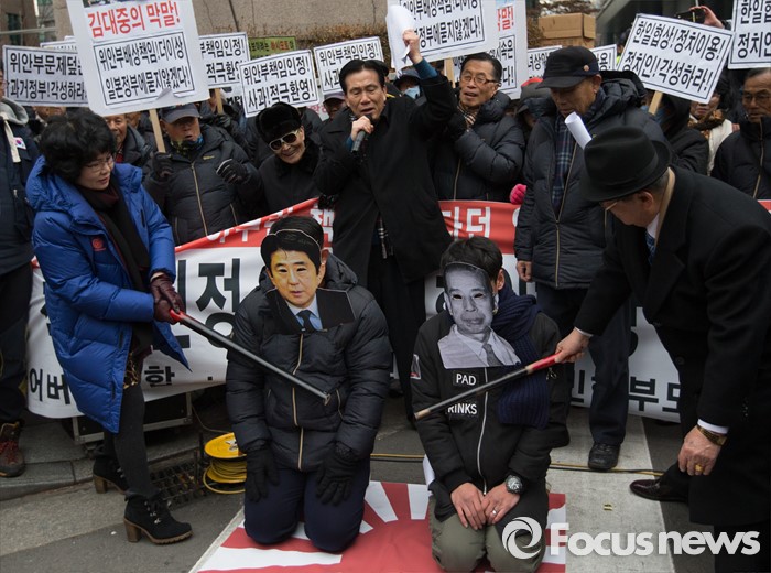 (서울=포커스뉴스) 어버이연합 등 보수 단체 회원들이 6일 오후 서울 종로구 일본대사관 앞에서 아베 총리와 전범인 외조부 기시 노부스케를 몽둥이로 때리는 퍼포먼스 퍼포먼스를 하고 있다.