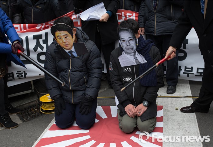 (서울=포커스뉴스) 어버이연합 등 보수 단체 회원들이 6일 오후 서울 종로구 일본대사관 앞에서 아베 총리와 전범인 외조부 기시 노부스케를 몽둥이로 때리는 퍼포먼스 퍼포먼스를 하고 있다.