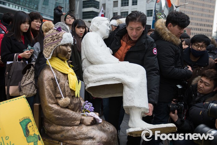 (서울=포커스뉴스) 6일 오후 서울 종로구 위안부 소녀상 앞에서 올해로 24주년을 맞은 일본군 위안부 문제 해결을 위한 1212차 수요 시위가 열리고 있는 가운데 김학순 할머니 동상이 소녀상 옆으로 옮겨지고 있다.