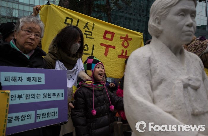 (서울=포커스뉴스) 6일 오후 서울 종로구 위안부 소녀상 앞에서 올해로 24주년을 맞은 일본군 위안부 문제 해결을 위한 1212차 수요 시위가 열리고 있다. 한 아이가 김학순 할머니 동상 뒤에서 해맑게 웃고 있다.