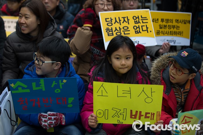 (서울=포커스뉴스) 6일 오후 서울 종로구 위안부 소녀상 앞에서 올해로 24주년을 맞은 일본군 위안부 문제 해결을 위한 1212차 수요 시위가 열리고 있는 가운데 아이들이 피켓을 들고 있다.