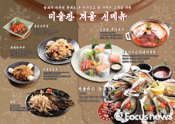 이번 신메뉴는 △겨울 제철음식인 석화를 활용한 '겨울바다 눈꽃석화' △'생 연어사시미&문어숙회' △'생 연어무침' △납작당면을 넣은 '미술관 잡채' △'찹쌀 탕수육' △말린 명태를 김에 싸서 청양마요네즈 간장과 함께 먹는 '짝태' △'킹왕짱 부대찌개' 등 총 7가지다.