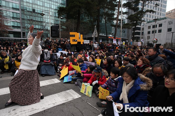 (서울=포커스뉴스) 일본군 위안부 문제 해결을 위한 정기 수요집회 24주년인 6일 오후 서울 종로구 주한일본대사관 앞에서 열린 집회에서 한 예술인이 퍼포먼스를 하고 있다.