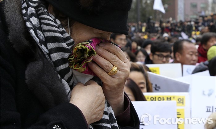 (서울=포커스뉴스) 6일 서울 종로구 옛 일본대사관 앞에서 열린 제1212차 정기수요집회에서 이용수 할머니가 손수건으로 눈가를 훔치고 있다. 단일 주제로 벌이는 세계 최장기 집회로 알려진 정기수요집회는 1992년 1월 8일 시작해 금일로 24주년을 맞이했다.