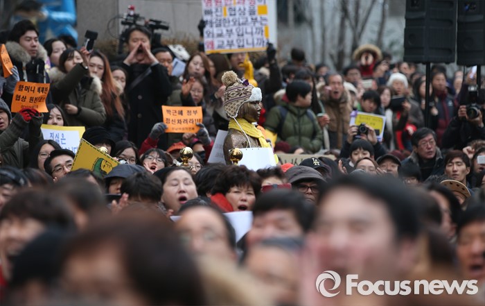 (서울=포커스뉴스) 일본군 위안부 문제 해결을 위한 정기 수요집회 24주년인 6일 오후 서울 종로구 주한일본대사관 앞에서 제1212차 수요집회가 열리고 있다.
