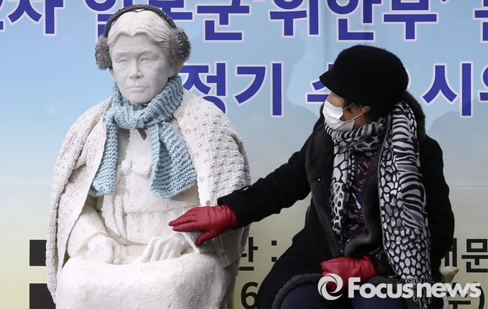 (서울=포커스뉴스) 6일 서울 종로구 옛 일본대사관 앞에서 열린 제1212차 정기수요집회에서 이용수 할머니가 김학순 할머니의 석상을 바라보고 있다. 단일 주제로 벌이는 세계 최장기 집회로 알려진 정기수요집회는 1992년 1월 8일 시작해 금일로 24주년을 맞이했다.
