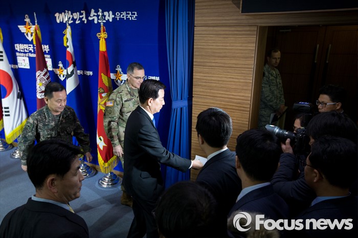 (서울=포커스뉴스) 한민구 국방부 장관과 이순진 합참의장, 커티스 스캐퍼로티 주한미군사령관이 7일 오전 서울 용산구 국방부에서 북한 수소탄 실험에 대한 한미 양국 공조 방안을 발표한 뒤 브리핑룸을 나서고 있다.