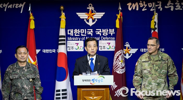 (서울=포커스뉴스) 한민구 국방부 장관이 7일 오전 서울 용산구 국방부에서 북한 수소탄 실험에 대한 한미 양국 공조 방안을 발표하고 있다. 한 장관 왼쪽은 커티스 스캐퍼로티 주한미군사령관, 오른쪽은 이순진 합참의장.