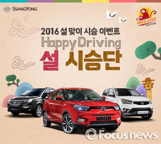 쌍용차는 설날 귀성차량으로 티볼리, 코란도 C, 코란도 투리스모 등 총 30대를 시승할 수 있는 ‘해피 드라이빙(Happy Driving) 설 시승단’을 모집한다.